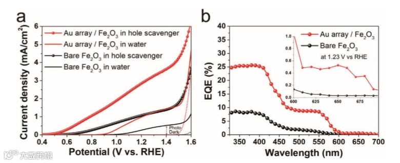 b) external quantum efficiency (EQE) spectra at 1.23 V versus RHE of bare Fe2O3 and Au array/Fe2O3 photoanodes in a 1 m KOH electrolyte (pH 13.7). All measurements were performed by using a three-electrode configuration with a Pt wire counter electrode and an Hg/HgO reference electrode.
