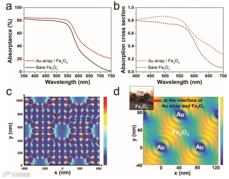 d) numerical rigorous coupled-wave analysis field distribution (|E|2) on the y–x plane of Au array/Fe2O3 (at the interface between Au NSs and Fe2O3) at the wavelength of 520 nm.