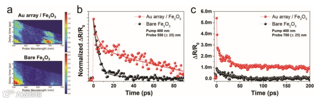 a) 2D presentations of transient absorption (TA) spectra as a function of time delay and probe wavelength in a false-color plot,