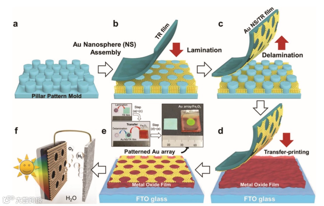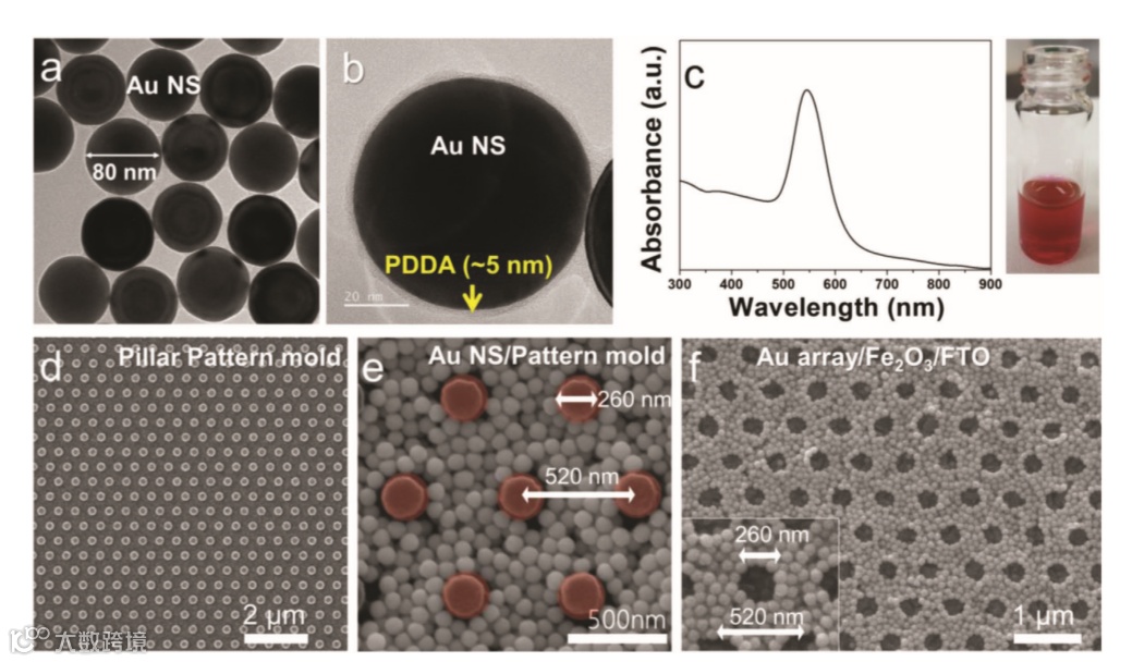 f) the transfer-printed Au NS patterned array (Au array) on Fe2O3 film.