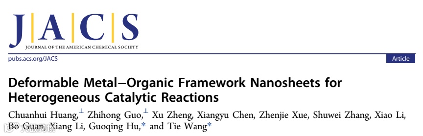 近日,中科院化学所王铁教授课题组在国际知名期刊Journal of the American Chemical Society (2018 IF: 14.695)上发表题为“Deformable Metal-Organic Framework Nanosheets for Heterogeneous Catalytic Reactions”的研究。Chuanhui Huang和 Zhihong Guo为本文共同第一作者。
