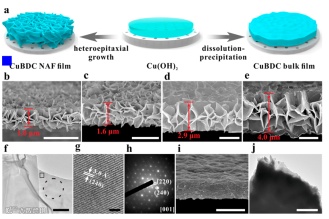 (i) Cross-sectional SEM image of the as-synthesized bulk-type MOF film. (j) TEM images of the bulk-type MOF film. Thediameter and pore size of the nylon-66 membrane were 47.0 mm and