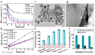 (f) Recyclability of the Pd NCs@NAF composites and Pd NCs for the hydrogenation of 1-hexene. Scale bars represent 50 nm for (c) and 2nm for its inset, and 500 nm for (d). Error bars represent the standard deviation of three replicate samples.