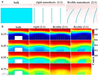 (a) Velocity vectors and (b) concentration fields evolving with time.The numbers in brackets represent the ratio between the height and spacing of the nanosheets. Only the flexible nanosheets generated vortices and thus induced downward convection, which resulted in enhanced transport of reactants.