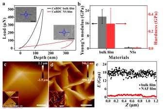 Typical load−displacement nanoindentation curves for different MOF film structures. The insets are scanning-electronmicroscope images of the surfaces of the bulk-type MOF and nanosheet films on Si and SiO2 substrates, respectively; the blue crosshair represents the test site.