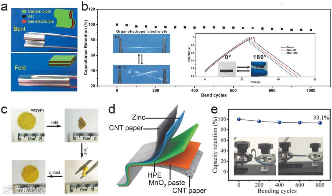 c. 聚合物固体电解质具有独特的弯曲刚度和弹性模量,使储能装置具有很高的柔韧性和延展性。