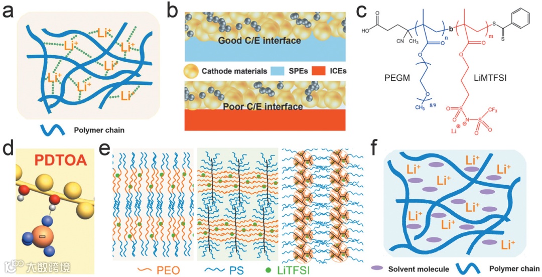 (d) Illustration of the interaction between thioamide groups in PDTOA and anions. (e) Illustration of the PEO-PS copolymers blended with LiTFSI).