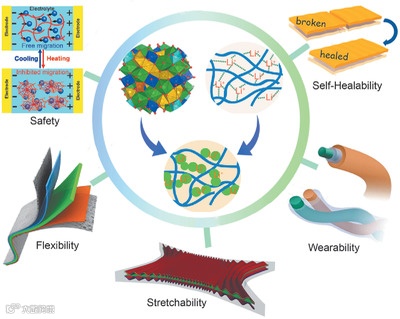 可穿戴和可植入式设备强烈要求具有安全、柔软和多功能的不可或缺的储能系统。然而,商用储能设备的有毒和易燃有机液体电解质会造成重大的安全隐患,并且由于有机液体电解质的密封性很强,很难达到要求的柔韧性和延展性。