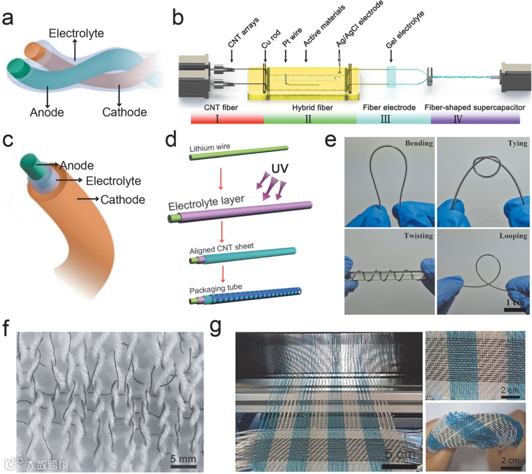 (f) fiber-shaped supercapacitors being woven into flexible textiles.