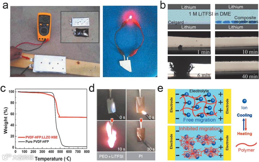 (a) Impact of external factors on safety. The lift photograph indicates the pouch-type cells with solid electrolyte and liquid electrolyte after nail penetration test. The right photograph indicates solid-state, soft-package lithium batteries to power a red LED after being cut.