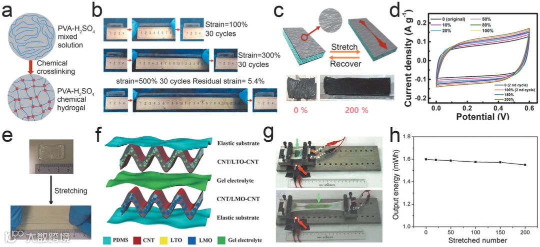 (g) Stretchable lithium‐ion battery lighting up an LED before and after stretching by 400%.