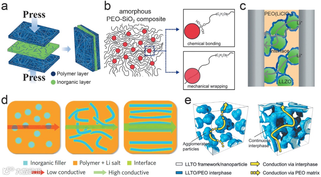 (e) Schematic representation of possible conduction mechanism in composite electrolytes with agglomerated nanoparticles and 3D continuous framework.