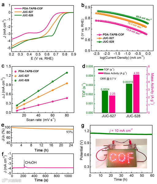(a) LSV (at 1600 rpm) curves of PDA-TAPB-COF,JUC-527, and JUC-528 in O2-saturated 0.1 M KOH electrolyte.