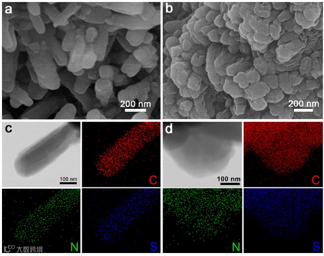 (c, d)TEM images and EDS mapping for C, N and S elements of (c) JUC-527 and (d) JUC-528.