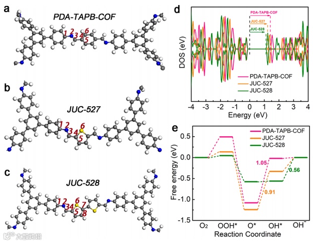 (d, e) Calculated DOS and free energy diagrams (sites-5) for PDATAPB-COF, JUC-527, and JUC-528.