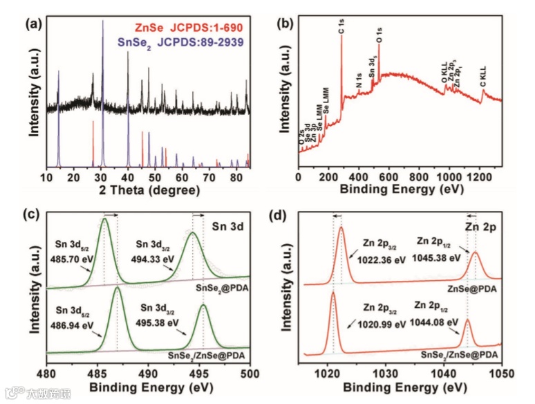 a) XRD pattern of SnSe2/ZnSe@PDA nanobox (black line), ZnSe (JCPDS:1-690, red line) and SnSe2 (JCPDS:89-2939, blue line).