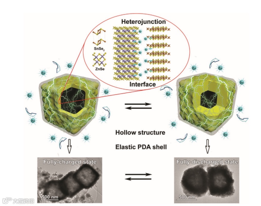 合理设计的高容量、长寿命、低成本电极材是钠离子电池必不可少的组成部分。本研究成功地设计并制备了一种由异质结硒化物核和聚多巴胺壳(SnSe2/ZnSe@PDA)组成的多层纳米盒。由于Na+离子在异相界面上的电荷重分布和晶格畸变,使得Na+离子很容易被吸附和快速转移,从而促进了反应动力学和循环行为。这种材料在1000多个长期循环中以1A g -1的速度提供了616mahg-1的高可逆容量和优越的倍率性能,为今后储能的实际应用展现出更多的可能性。
