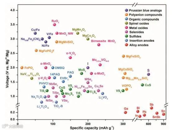 图2. 不同类型的镁正极、插入负极和合金负极的电压容量图