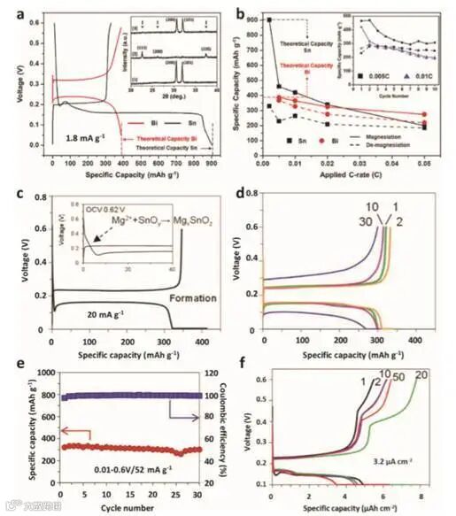 a) The first galvanostatic discharge/charge curves of Sn electrode (black). Inset-XRD spectra for (1) as-fabricated Sn, (2) magnesiated Sn and (3) demagnesiated Mg2Sn.
