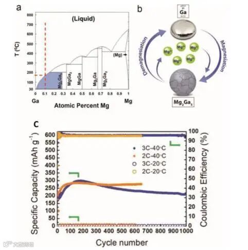 c) Long cycle life of Mg2Ga5 anode in the APC–LiCl electrolyte solution.