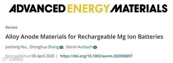 近日,山东大学的张忠华与巴伊兰大学的Doron Aurbach等人在国际知名期刊Advanced Energy Materials (2018 影响因子:24.88)上发表题为“Alloy Anode Materials for Rechargeable Mg Ion Batteries”的综述。本文第一作者是Jiazheng Niu。