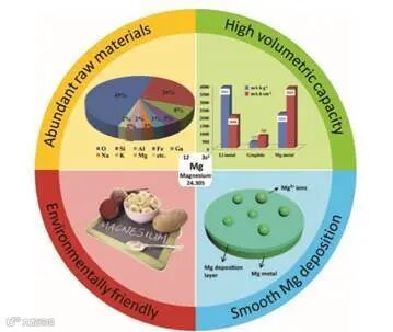 在这些替代电池系统中,可充镁离子电池(mib)因其独特的优点和性能而受到世界各国的关注,有几家公司(北美丰田研究所和最近的索尼公司)正在努力实现其商业化。镁是一种丰富的资源(镁的原子丰度是地壳中锂的约104倍),是无毒元素(有些食物中含有镁)。Mg还为每个氧化还原中心提供两个电子,具有比Li金属(2046mah cm-3)和商业化石墨负极(760mah cm-3)更高的容量(3833mah cm-3)。
