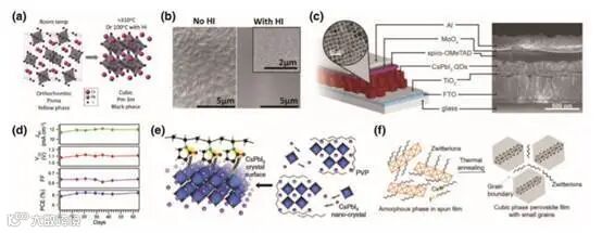 e) Mechanism of PVP-induced cubic phase stability: PVP anchored at the surface of CsPbI3 crystals via the combination between N/O and Cs. The negative state in CsPbI3 crystals surface reduces surface tension significantly and stabilizes cubic phase. Reproduced with permission.