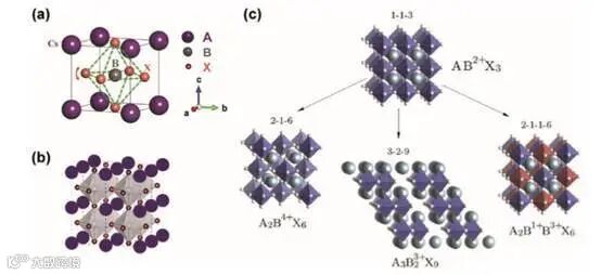 c) Schematic relation between the crystal structures of typical and derivative CsBX3 perovskites. Reproduced with permission.