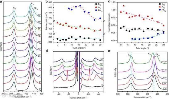 图4:扭曲的双层和三层MoS2薄膜的拉曼特性