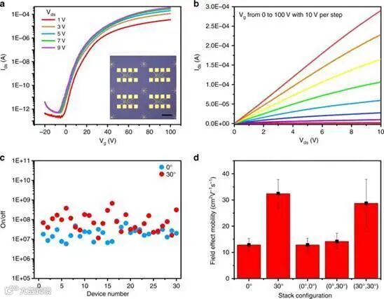b Electrical output curves of a typical 30° twisted bilayer MoS2 FET.