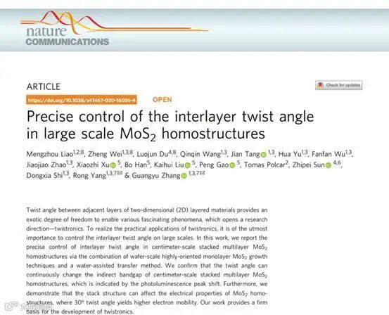 二维(2D)层状材料相邻层间的扭转角提供了一种奇特的自由度,并出现了各种有趣的现象,这就为Twistronics开辟了一个研究方向。层间扭转角的精确控制对实现Twistronics的实际应用,起到了至关重要的作用。本文采用外延生长法单和水助剂转移法相结合的方法,实现了对厘米级多层MoS2同质结构层间扭曲角的精确控制。并发现扭转角可以连续改变厘米级叠层MoS2同质结构的间接带隙。此外我们还证明了叠层结构可以影响MoS2同质结构的电学性质。该工作为Twistronics的发展提供了坚实的基础。