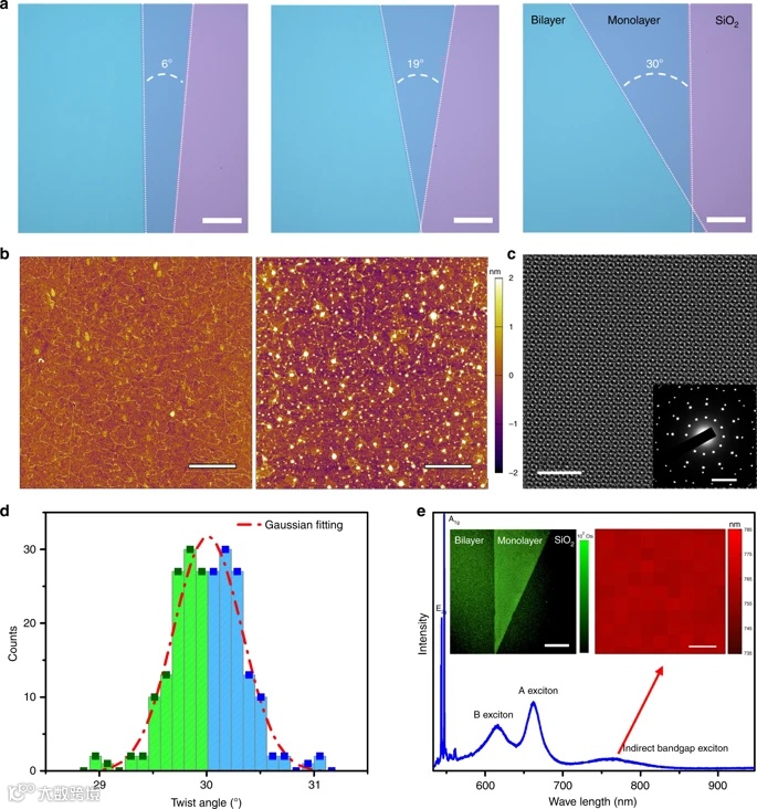 a Optical Images of three typical transferred twisted bilayer MoS2 films on Si substrates with 300 nm SiO2: 6°, 19°, and 30°, scale bar 300 μm.