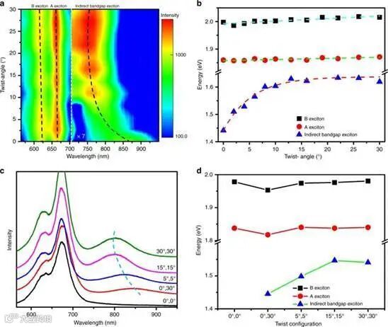 b Excitons’ energy as a function of the twist angle; dash lines are linear (A and B excitons) and exponential (indirect bandgap exciton) fitting.