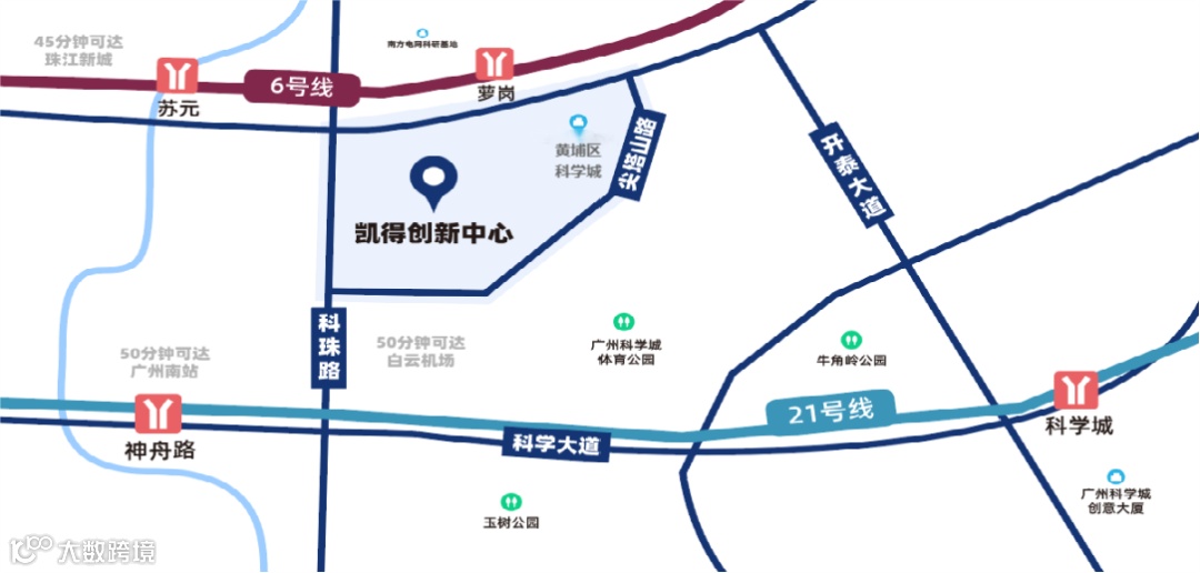 凯得创新中心位于广州市高新技术产业开发区科学城科研路3号,致力成为粤港澳大湾区智能信息技术创新基地。园区占地面积约2万平方米,总建筑面积超2.6万平方米,是以智能信息、智能光电为方向,以促进科技成果转化,培育科技创业人才和科技型企业,促进广州市高新技术产业发展为目标的专业孵化器。