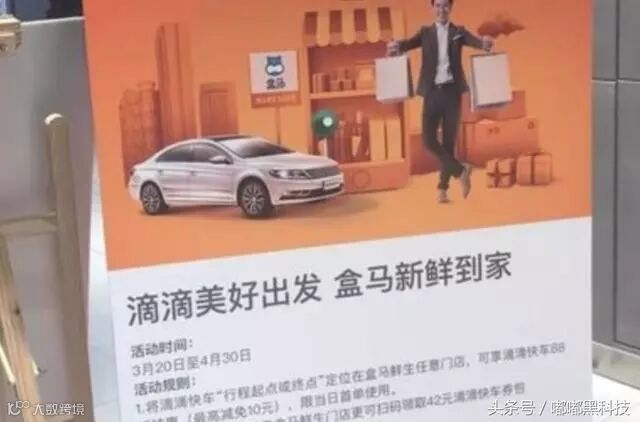所以,滴滴和盒马非常低调的搞了个营销活动,在3.20-4.30期间,用户使用滴滴快车将“起点或终点”定位在盒马鲜生任意门店,可享滴滴快车88折折扣;并且用户在盒马鲜生门店还可扫码领取滴滴出行礼包。