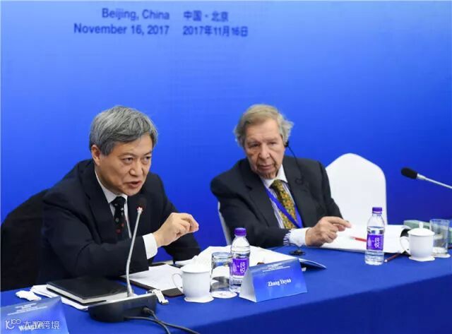 中国社会科学院世界经济与政治研究所所长张宇燕(左)在“中共十九大:中国发展和世界意义”国际智库研讨会的平行会议上发言(11月16日摄)。新华社记者 陈晔华 摄