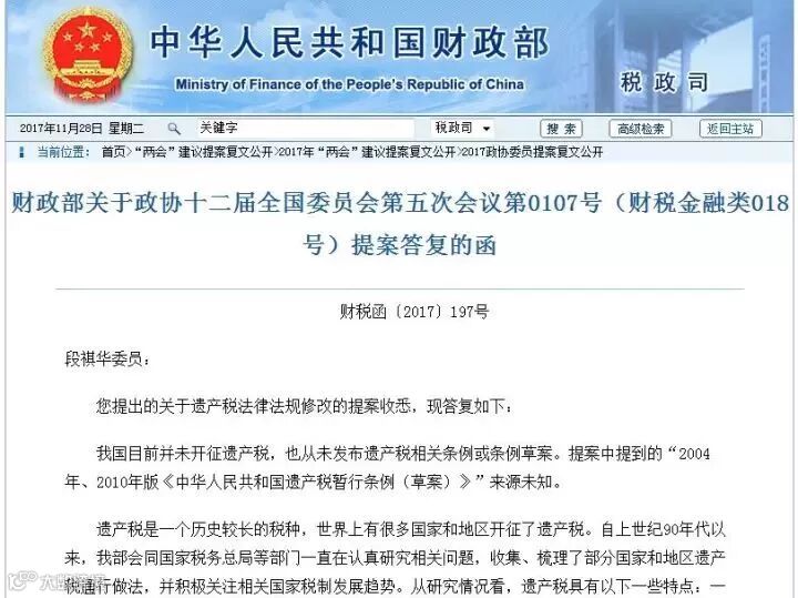 近日,财政部网站一则提案答复函正式回应了我国遗产税问题:我国目前并未开征遗产税,也从未发布遗产税相关条例或条例草案。下一步,财政部将继续跟踪国际上遗产税的发展趋势,进一步研究遗产税有关问题。