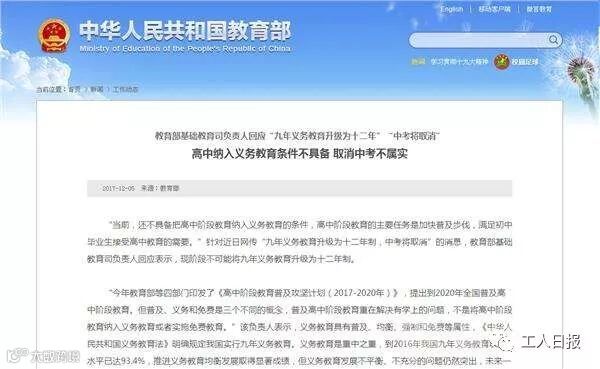 近日,网络上传言“九年义务教育升级为十二年制,中考将取消”。