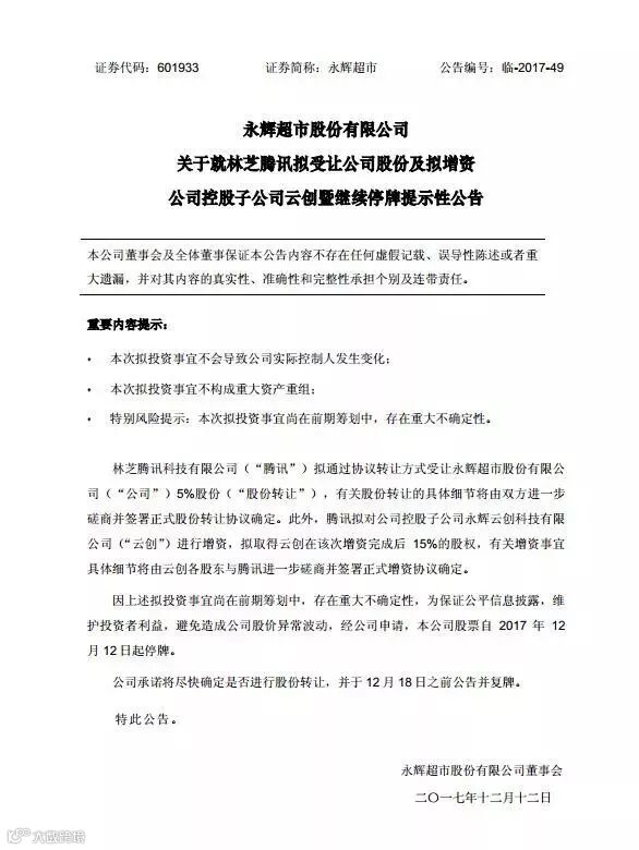 公告称,其股票将从 2017 年 12 月 12 日起停牌,并于 12 月 18 日之前公告并复牌。而在公告中,永辉超市给出了三点重要内容提示: