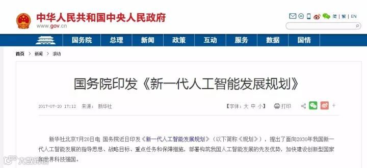 新华社北京7月20日消息,国务院印发《新一代人工智能发展规划》(以下简称《规划》),提出了面向2030年我国新一代人工智能发展的指导思想、战略目标、重点任务和保障措施,部署构筑我国人工智能发展的先发优势,加快建设创新型国家和世界科技强国。