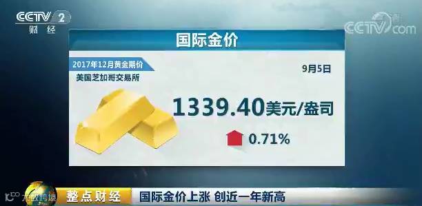 据央视财经报道,8月底以来,随着亚洲地缘政治危机的逐步升级,黄金避险情绪升温,国际金价一路走高,美国时间9月5号,12月份黄金期货价格盘中一度达到1345.50美元/盎司,创近一年新高。