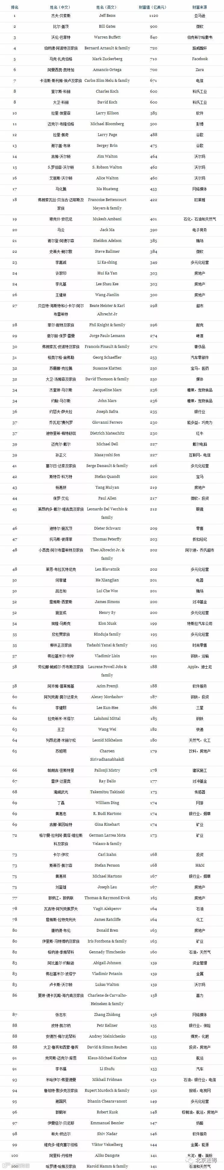 3月6日,福布斯发布的2018年度全球亿万富豪榜显示,2018年共有2208名身家达十亿美元的亿万富豪上榜(2017年是2043人),平均净财富为41亿美元,创下纪录。前20位富豪的净财富总额创历史新高,达1.2万亿美元,高于2017年的9688亿美元。进入前20名所需的净财富超过以往,至少需390亿美元,高于2017年的304亿美元。