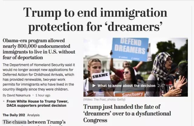 《纽约时报》报道称,即日起美国政府将不再接受任何来自无证移民的新申请,但DACA计划的受益人在明年3月5日之前并不会受到任何影响。
