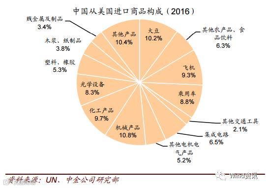 中国从美国进口农产品是中美贸易谈判的关注点。中国从美国进口的主要商品类别包括:大豆、飞机、乘用车、集成电路、化工产品、光学设备等。农产品将会成为双方贸易谈判的重要方面:一方面,中国是美国大豆的最大买家,美国大豆出口超过60%销往中国;另一方面,中国对美国农产品还有很大的购买潜力,中国占美国其他农产品出口份额不到 10%。