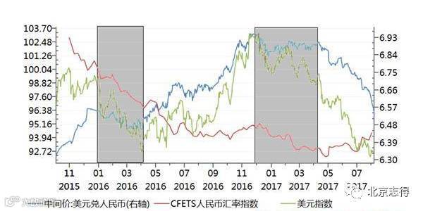 在没有引入逆周期因子之前的两轮美元贬值过程中,人民币保持对美元汇率相对稳定,而人民币汇率指数(CFETS)则一路下行(参见下图)。