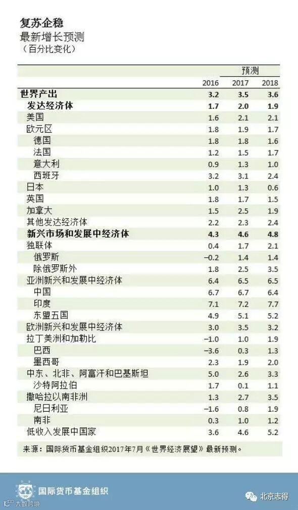 今年4月《世界经济展望》预测的全球增长回升将继续,全球产出预计2017年增长3.5%,2018年增长3.6%。