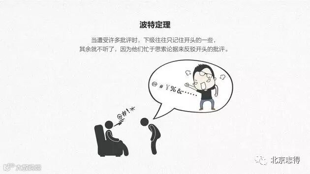 五、波特定理:当遭受许多批评时,下级往往只记住开头的一些,其余就不听了,因为他们忙于思索论据来反驳开头的批评。