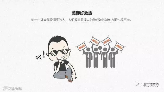 十一、美即好效应:对一个外表英俊漂亮的人,人们很容易误以为他或她的其他方面也很不错。
