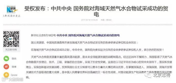 在宣布可燃冰试采获得成功后,中共中央、国务院发贺电向参加这次任务的全体参研参试单位和人员,表示热烈的祝贺!