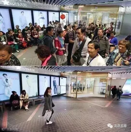 2016年9月21日,中国游客络绎不绝的首尔中区免税店(上图),与3月13日下午的冷清现状形成了鲜明对比。图片:韩联社